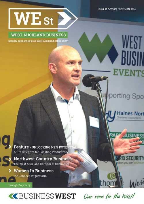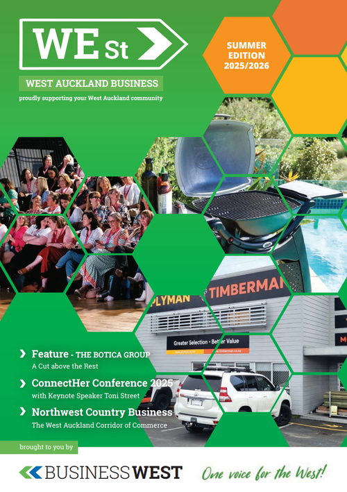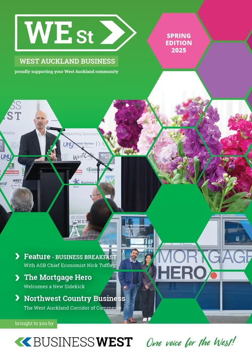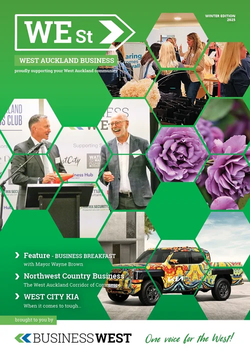 WEst is Business West’s flagship publication, capturing the stories, people, and momentum of West Auckland’s business community. Each issue showcases local leaders, emerging enterprises, community initiatives, and the ideas shaping our region, creating a living record of the businesses that make the West thrive. Together, these editions reflect the diversity, resilience, and ambition of our members, and the collective strength of doing business in West Auckland.